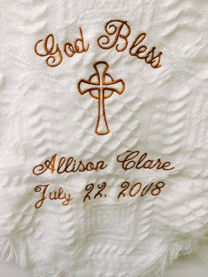 Personalized Embroidered Baptismal/Birth Blanket sweetly embroidered in your choice of color. This 40" X 40" acrylic blanket will sure to become a family heirloom.