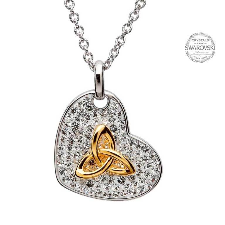 This lovely Trinity Pendant features a tilted heart crafted out of sterling silver and adorned with Swarovski® crystals. In the middle of the heart, a gold plated Trinity Knot glows brightly. Handcrafted in Ireland and hallmarked at the Assay office in Dublin Castle.
