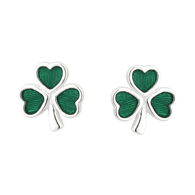 Shamrock Earrings, made in Ireland. Please note, per NJ State Health Code, all earrings are final sale. These pretty little shamrock earring feature a green stone inside the Sterling Silver setting.