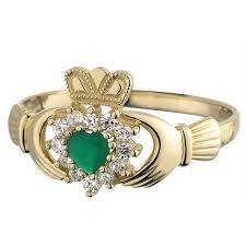 This is a beautiful gold Claddagh ring adorned with green agate and a sparkle of CZ.