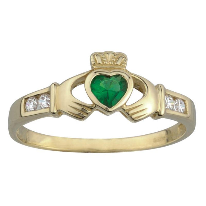 This is a stunning Gold Claddagh with a Synthetic Emerald as heart and CZ on cuffs. This beautiful ring was crafted in Ireland, and comes boxed.