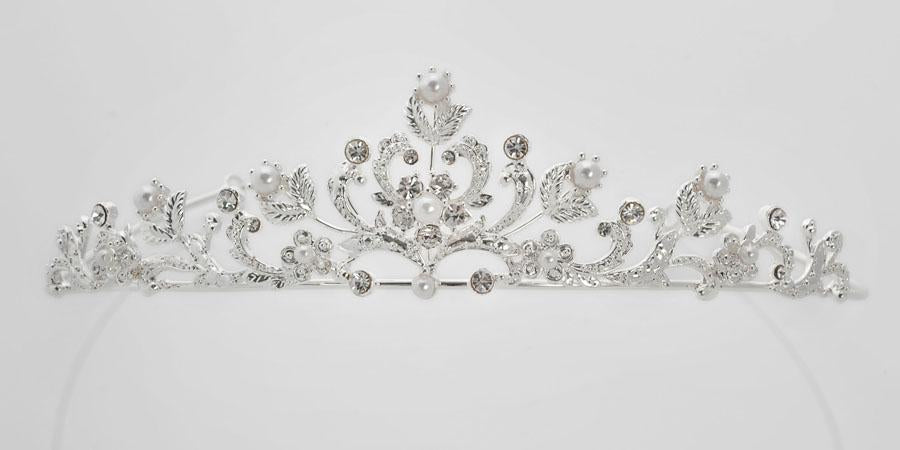 A Tiara veil with an attached merrow edge 2 tier veil with pearls at the top. The Tiara has white pearls and rhinestones. Veiling is White.
