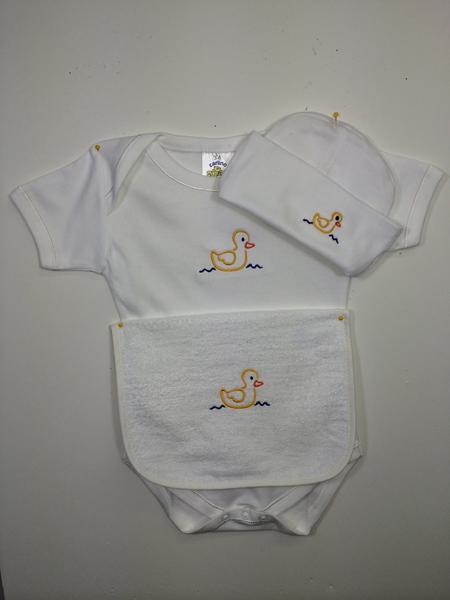 Embroidered Ducks, paddle along on this very cute design set. Hat, (fits to about 6 months old), romper (available in 5 sizes), and snap terry bib in fresh primary colors on beautiful white 100% cotton, makes for a perfect set. Our extra embroidery of a little duck on the bum is our mark of quality.