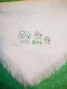Little sheep embroidered on this fringed acrylic blanket makes a sweet place for baby. Gra' means love in Gaelic, what better way to show it. The sheep are a companion piece to the 4pc New Baby Gift Set. Gift boxed and tied with a soft green bow. Blanket measures 40 x40