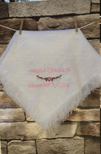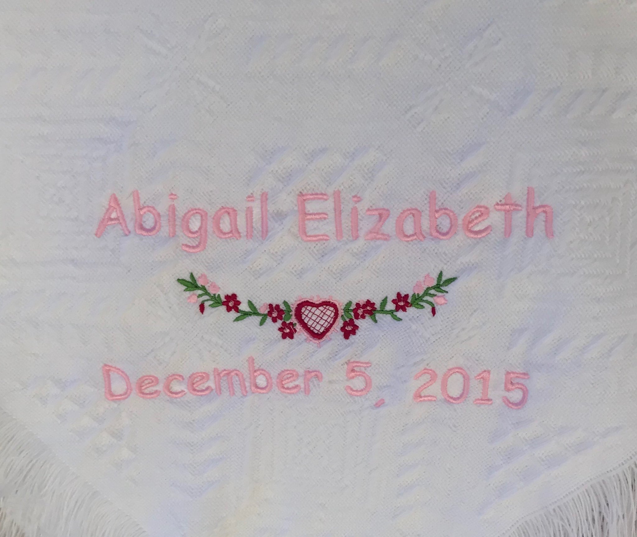 Personalized a sweet blanket for any little girl with hearts and flowers. Our blanket is made of soft acrylic and is 40" square with fringe. What better way to welcome baby than with gift with her very own name of it. The blanket is embroidered in our very own design and shop and work room upstair in our store.