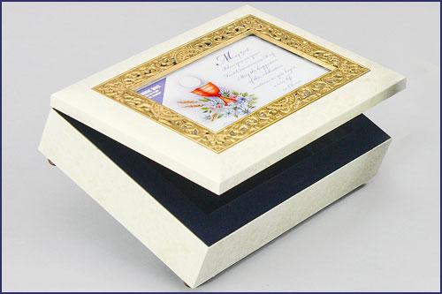 Music Box has frame on top to slip a 4x6" photo, the inside is lined and the bottom has a twist old fashion music box. Comes Boxed, suitablr for Boy or Girl.