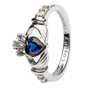 September Claddagh Birthstone Ring in Sterling Silver with a Sapphire CZ center stone and clear CZ on the cuffs. Ring comes boxed.